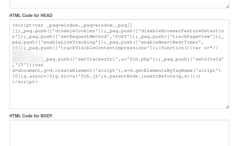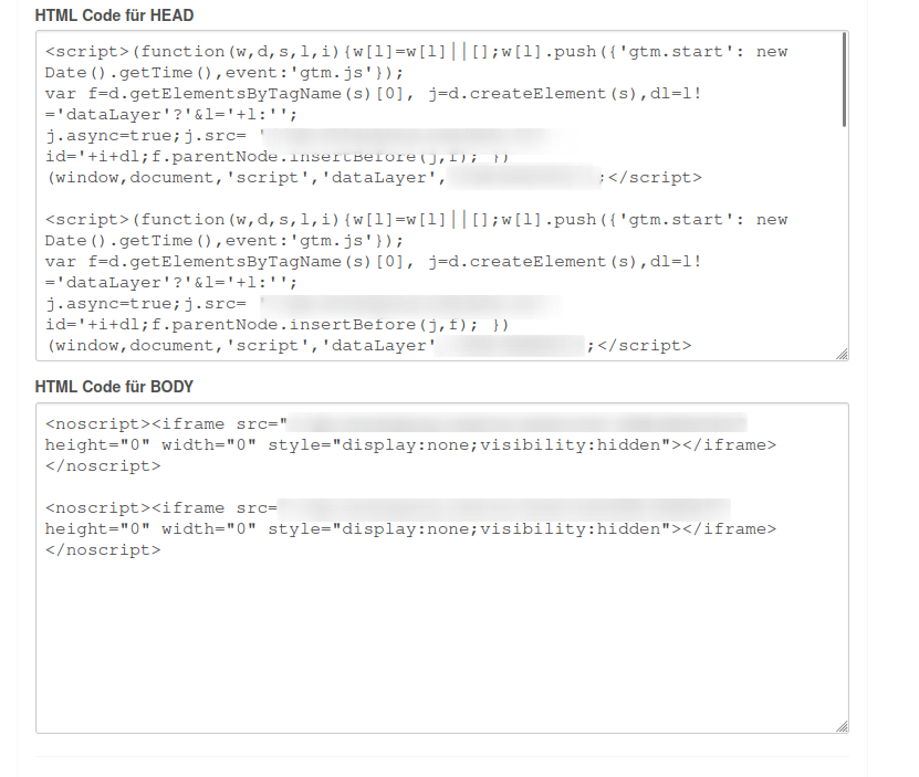 Google Tag Manager oder Matomo Skripte können unter Einstellungen > Portal Design in die passenden Felder für HTML Code für HEAD oder HTML Code für BODY integriert werden: