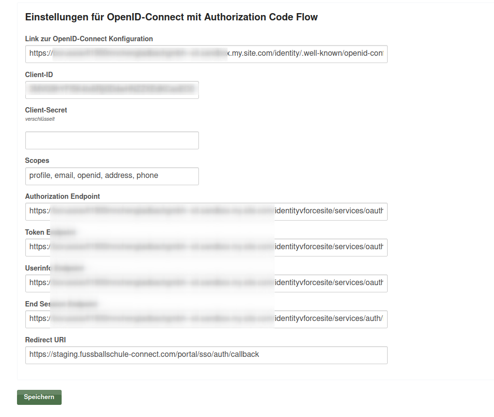 Nach dem für die FSC Installation eine eigene OIDC-Relying-Party angelegt wurde (wir stellen die RedirectURI bereit), können die Endpunkte und Authentifizierungsdaten eingetragen werden: