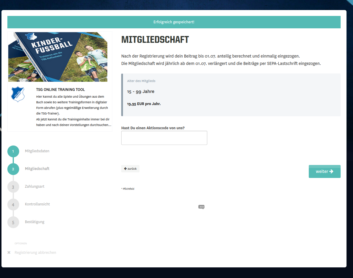 Durch den Einsatz von Aktionscodes können auch kostenfreie Testzeiträume für Käufer des zugehörigen Buches KINDERFUSSBALL – Trainieren wie die TSG Hoffenheim angeboten werden.