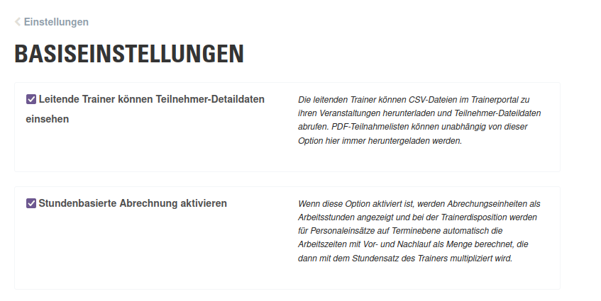 Unter Einstellungen > Trainer Basiseinstellungen kann die stundenbasierte Abrechnung aktiviert werden: