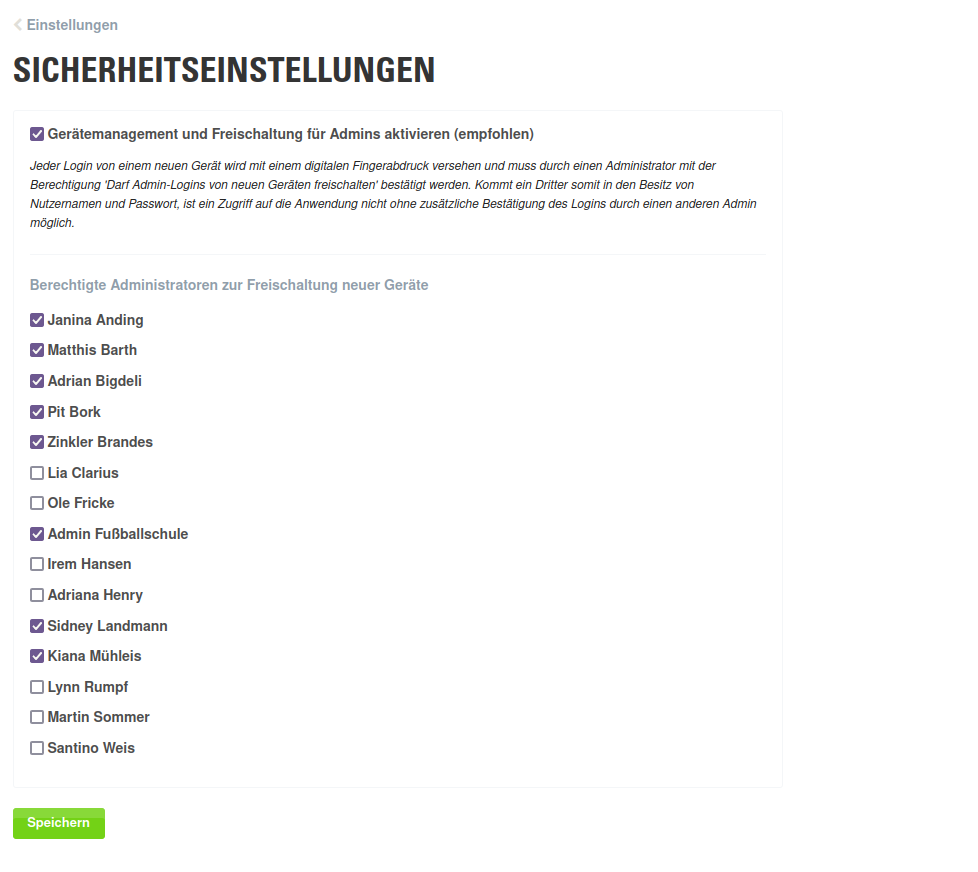 Diese Einstellung ermöglichen es, jedes Gerät (bzw. den Browser) einmal per Klick auf einen E-Mail Bestätigungslink oder durch einen der ausgewählten Admins zu bestätigen. Sollte ein Mitarbeiter sein Passwort an einen Dritten verlieren, wäre kein unmittelbarer Login durch diesen möglich. In Hinblick auf die sensitiven Personendaten von Kindern und Erwachsenen empfehlen wir daher unbedingt, diese Option zu aktivieren.