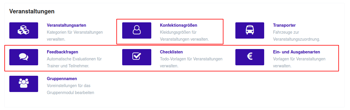 Beispiel: Wird die Konfektionsgröße 164 einfach in S umbenannt, würden alle Teilnehmer mit 164 jetzt mit Konfektionsgröße S im System erscheinen. Genauso verhält es sich bei den Feedbackfragen und Antworten sowie bei den Ein- und Ausgabenarten, denen bereits in der Finanzplanung Werte hinterlegt wurden.