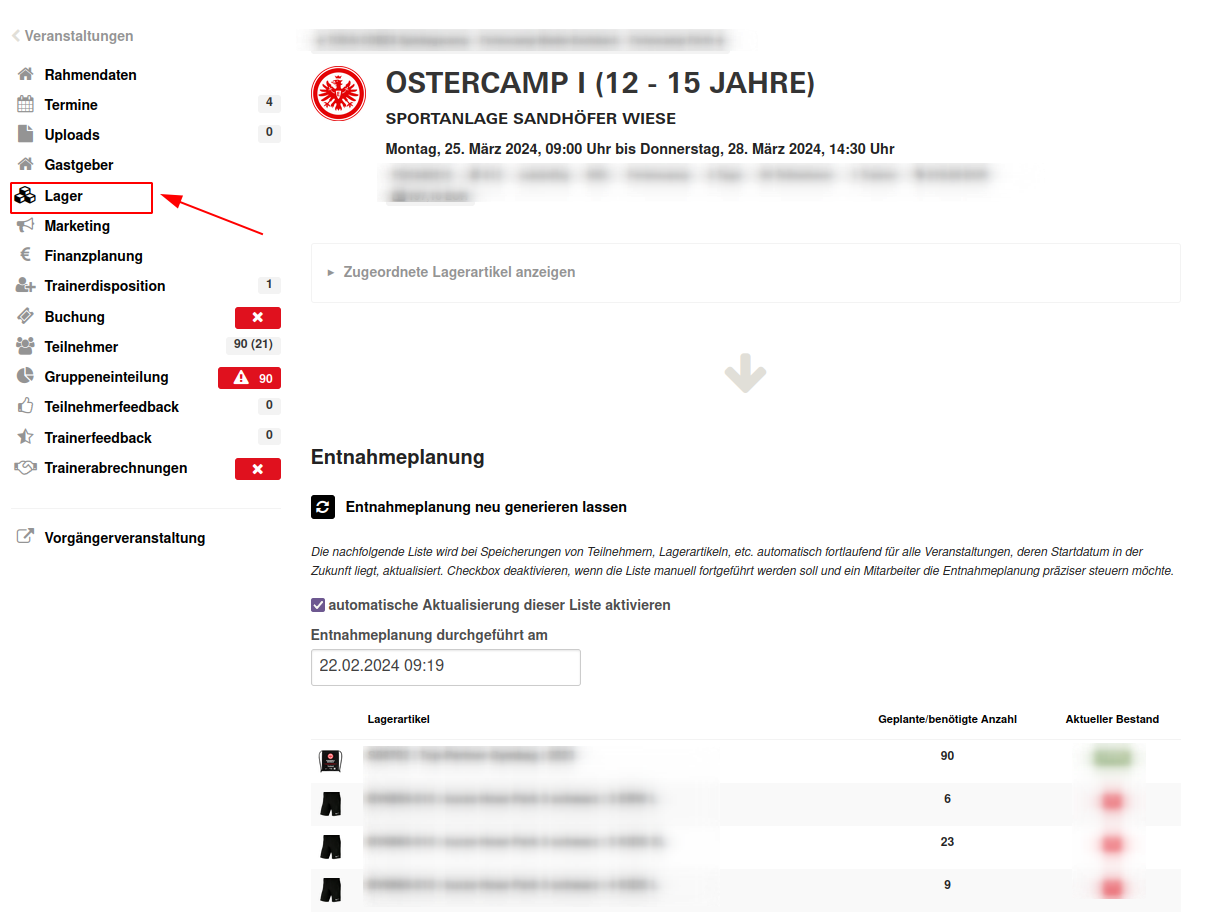 Wird das Lagermodul genutzt, sollte die Sammelbuchung der Entnahme optimalerweise direkt über die Veranstaltung (nicht über das Lager) angestoßen werden: