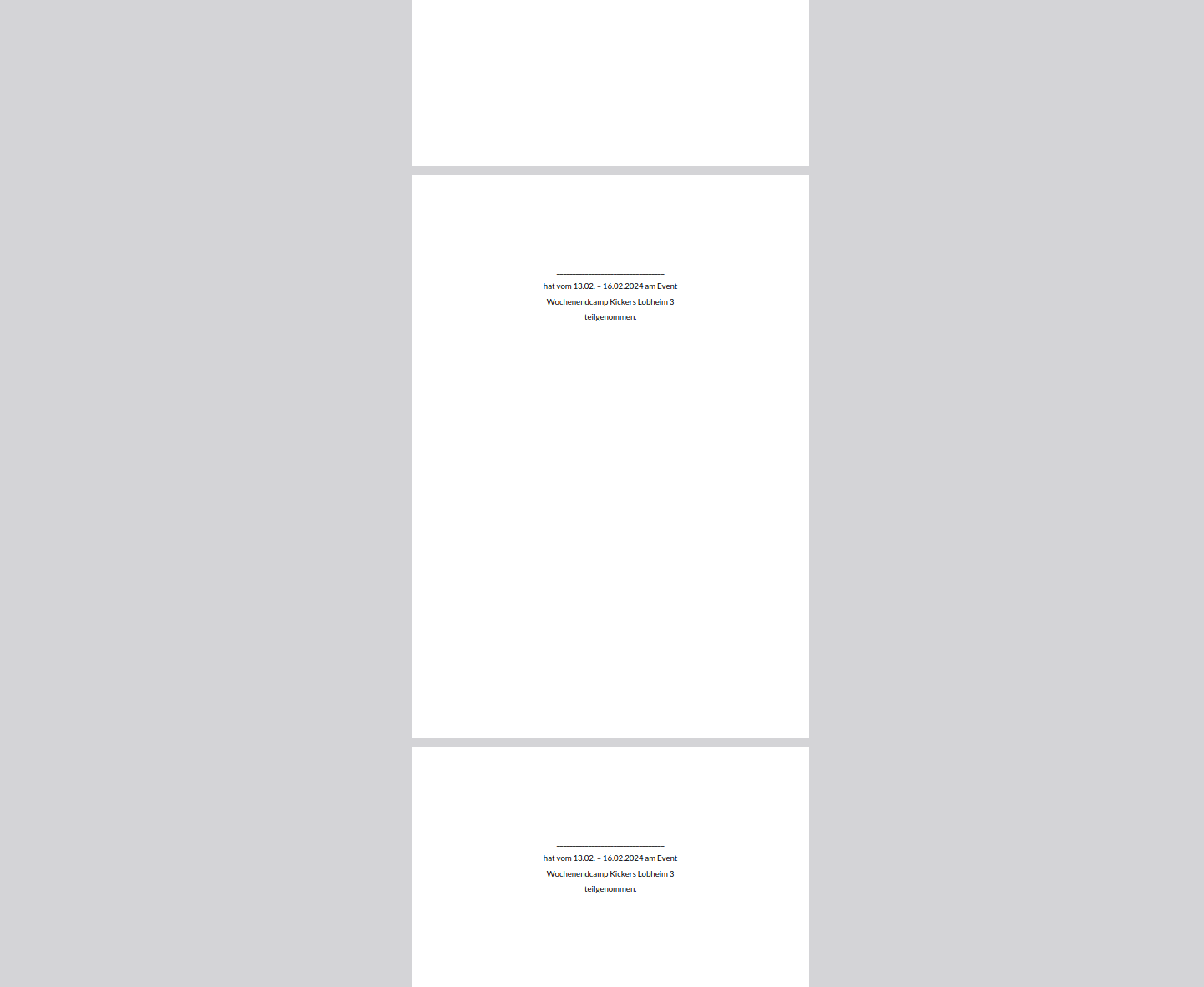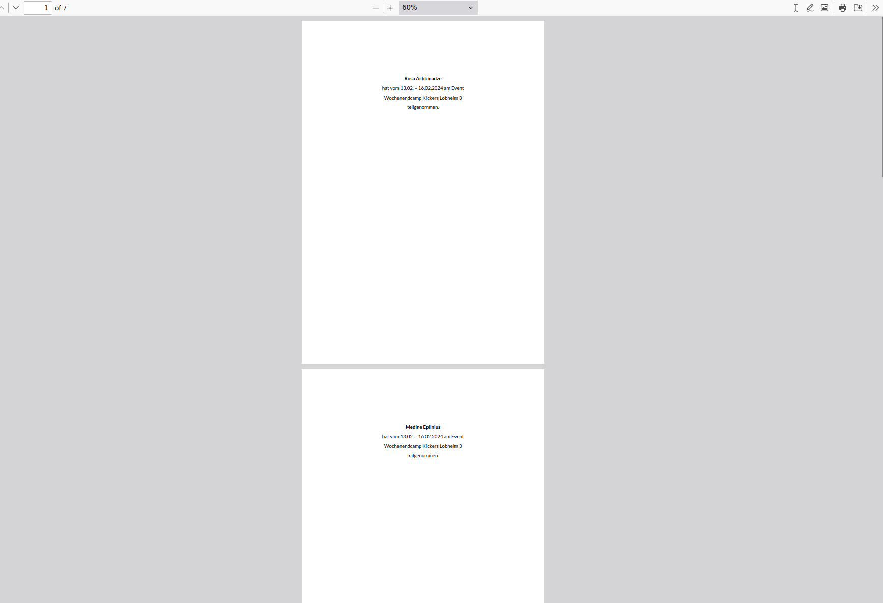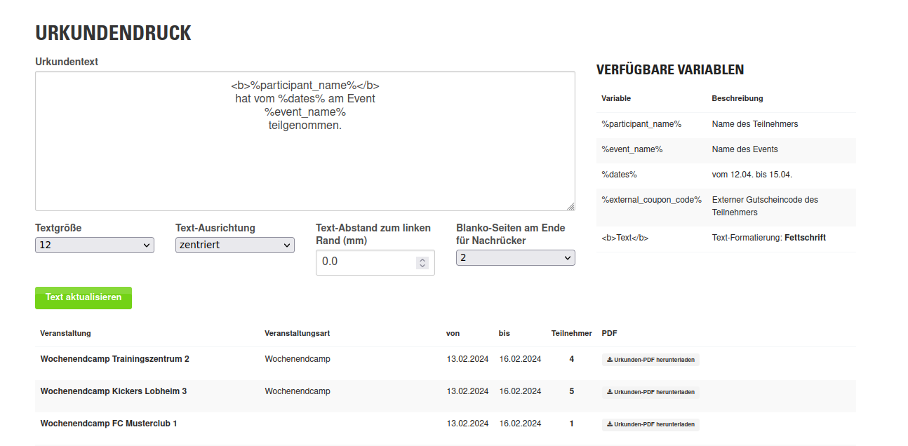 Über das Zusatzmodul Urkundendruck können Sammel-PDFs zum Druck auf Schablonen mit einem Klick je Event erzeugt werden. Mit Variablen kann der Inhalt individualisiert werden: