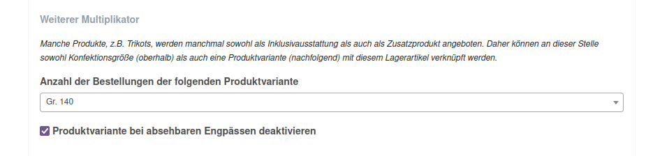 Bei Konfektionsgrößen gibt es diese Option nicht, weil die Konfektionsgrößen ein abstrakteres Konstrukt repräsentieren (z.B. Torwarttrikots vs. Feldspielertrikots oder andere Trikots für unterschiedliche Veranstaltungsarten). Administratoren sollen sich daher über ihr Admin-Profil für Engpässe im Lager benachrichtigen lassen: