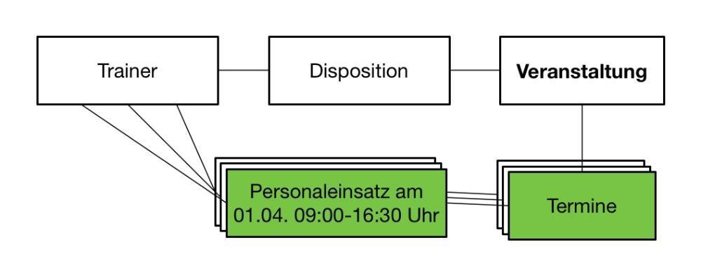 Weiterhin ergibt sich aus der einfachen Zuteilung Veranstaltung <> Trainer keine eindeutige Grundlage zur flexiblen finanziellen Abrechnung. Deswegen werden die Personaleinsätze der Trainer auf Terminebene dokumentiert. Die folgende Abbildung verdeutlicht den Zusammenhang zwischen Trainerdisposition, Personaleinsatz und Veranstaltungen: