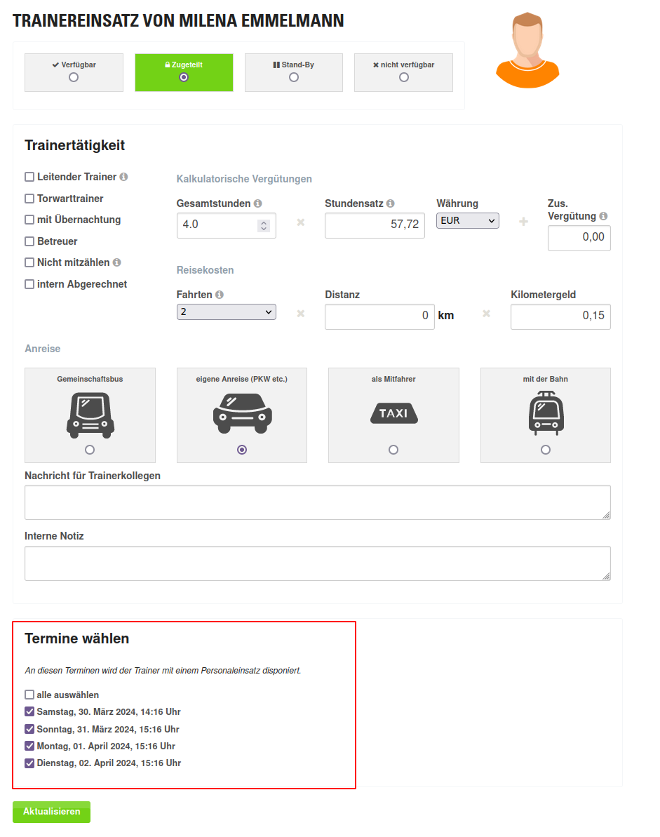 Termine als Abrechnungseinheit für Trainereinsätze (Dispositionen)
