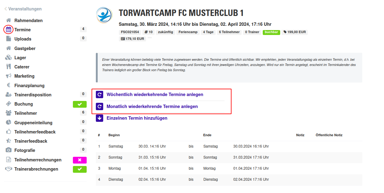 Zu jeder Veranstaltung können beliebig viele Veranstaltungstermine erstellt werden. Termine sollten so gewählt werden, dass sie sowohl als Informationsquelle für alle Zielgruppen sowie als Abrechnungseinheit für Trainer funktionieren.