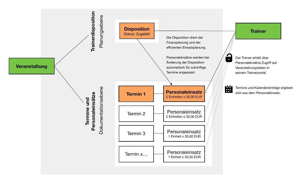 Eine Veranstaltung (grün) verfügt über eine Planungsebene in Form der Trainerdisposition als auch über eine Dokumentationsebene in Form von Terminen und Personaleinsätzen (beide orange).
