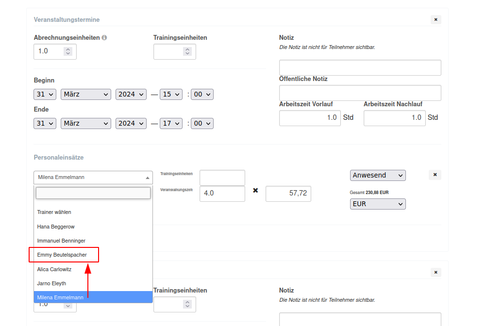 - Klickt anschließend auf + Trainer hinzufügen und wählt euren Aushilfstrainer aus der Liste aus. Dieser einzelne Termin erscheint nun automatisch im Terminkalender des Trainers. Zusätzlich erhält der Trainer Zugriff auf die Veranstaltungsseite im Trainerportal.