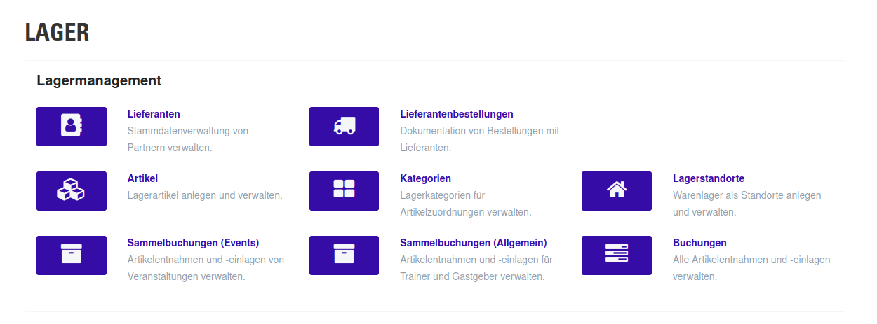 Lagerartikel repräsentieren eine baugleiche Ware. Unterschiedliche Konfektionsgrößen eines baugleichen Trikots werden jeweils als eigene Lagerartikel angelegt, eine Funktion zum Duplizieren unterstützt, die schnelle Anlage mehrere bauähnlicher Waren. Jeder Artikel kann ein Foto, eine Beschreibung und einen kritischen Wert bei Niedrigbestand enthalten. Wird ein Artikel an Teilnehmer einer Veranstaltung oder Trainer ausgegeben und nicht zurückerwarten, wird dieser als Verbrauchsartikel per Checkbox gekennzeichnet. Dem gegenüber stehen Artikel, die nach einer Entnahme wieder vollständig zurückerwartet werden (z.B. Minitore, Hütchen).