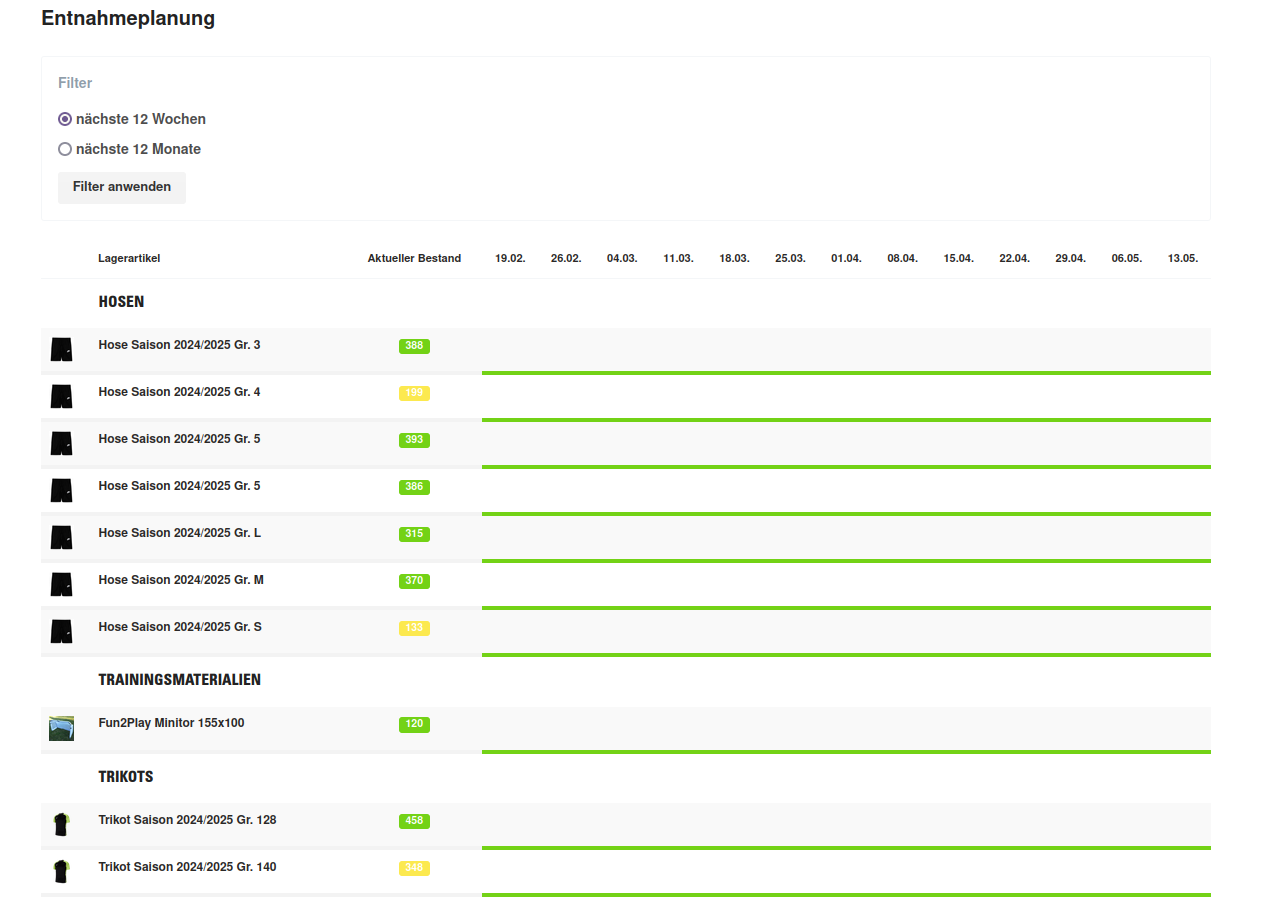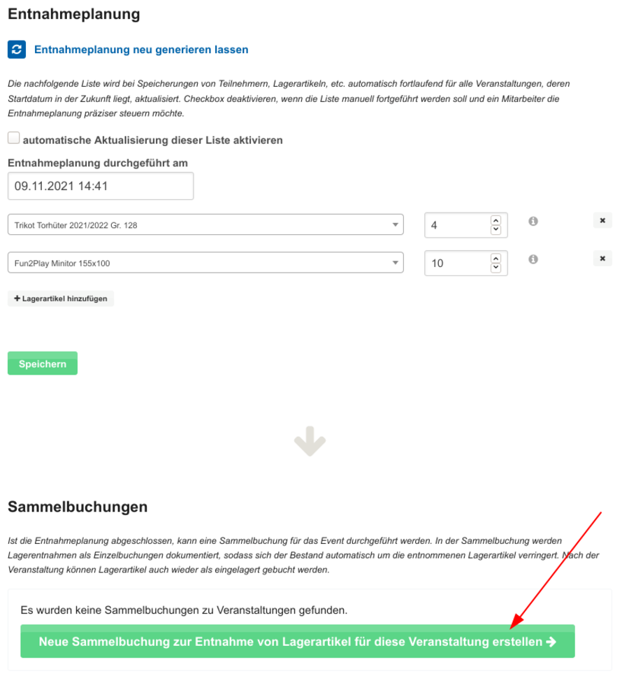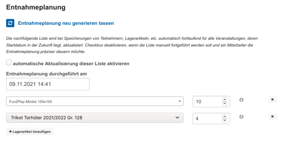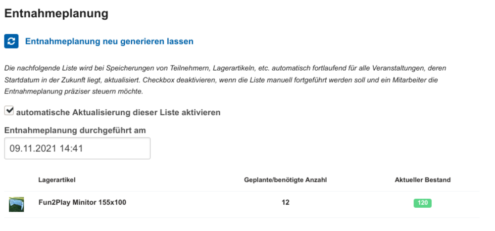 Für jede Veranstaltung wird fortlaufend eine Entnahmeplanung aktualisiert.