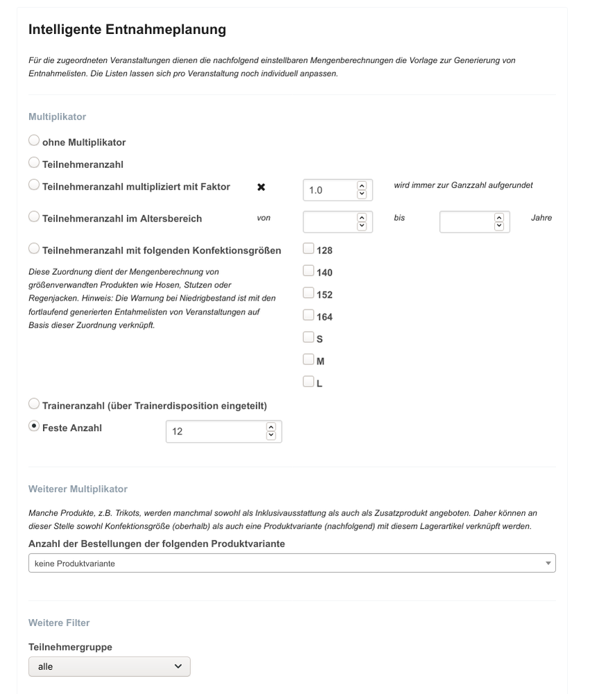 Mithilfe eines Multiplikators können Lagerartikel für Veranstaltungen automatisch für die zukünftige Entnahmeplanung berücksichtigt werden. Multiplikatoren können dynamisch sein (z.B. Teilnehmeranzahl / alle Torhüter / alle Teilnehmer mit Konfektionsgrößen 152 und 164 / …) oder statisch hinterlegt werden (einfach 80 Stück). Zusätzlich können Puffermengen hinterlegt werden.