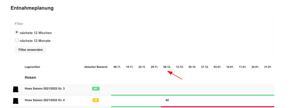 Für jeden Lagerartikel, der als Verbrauchsartikel gekennzeichnet ist, wird bei unterschiedlichen Systemereignissen (z.B. Teilnehmerbuchung, Buchungsbewegung eines Lagerartikels, etc.) automatisch ein Warndatum errechnet, ab dem der hinterlegte Niedrigbestand erreicht wird. Weiterhin wird ein kritisches Datum des Leerstandes errechnet, bei dem weniger Lagerartikel verfügbar sind als benötigt werden.