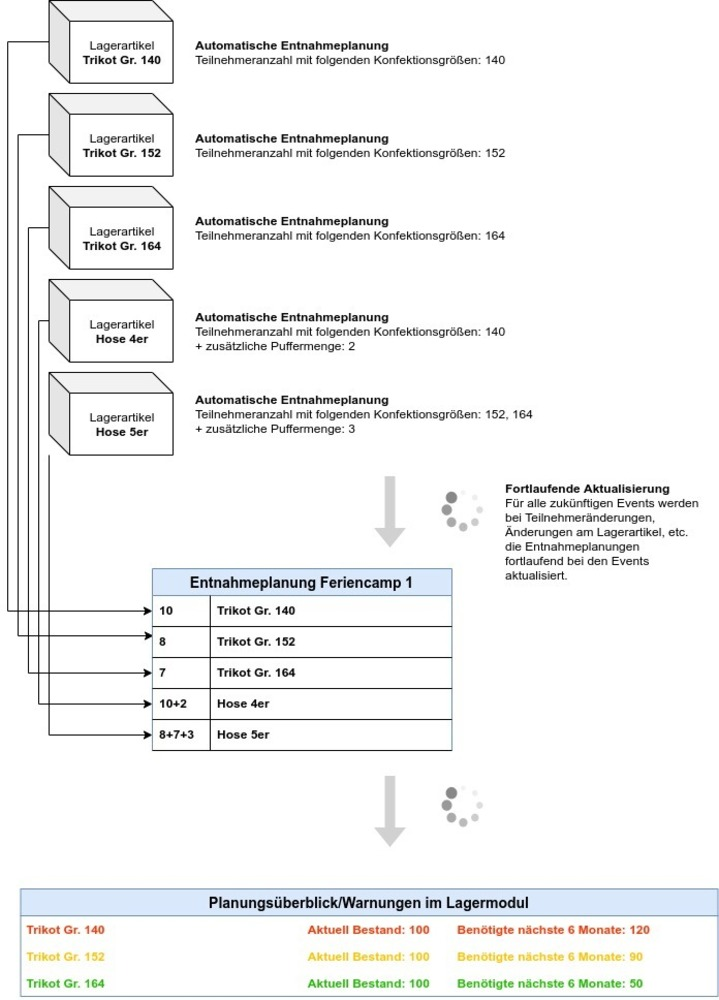 Jeder Lagerartikel wird den benötigen Veranstaltungen zugeordnet und mit einem manuellen oder automatischen Multiplikator versehen (z.B. der aktuellen Teilnehmeranzahl). Auf Basis der Veranstaltungszuordnung und des Multiplikators werden fortlaufend automatische Entnahmeplanungen in jeder Veranstaltung errechnet. Vor Beginn des Events kann diese Liste händisch abgeändert und in eine Sammelbuchung als Entnahme von Lagerartikeln überführt werden. Mithilfe von generierten PDF-Listen und QR-Codes lassen sich Artikelbewegungen aus einem oder mehreren Warenlagern schnell erfassen.