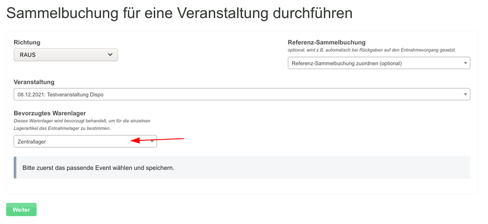 Als Nächstes wird die Sammelbuchung vorbereitet, in dem das bevorzugte Warenlager ausgewählt wird. Das System versucht alle Lagerartikel aus diesem Lager zu beziehen. Sind noch genügend Artikel im Lager vorhanden, werden die anderen Lager abgefragt: