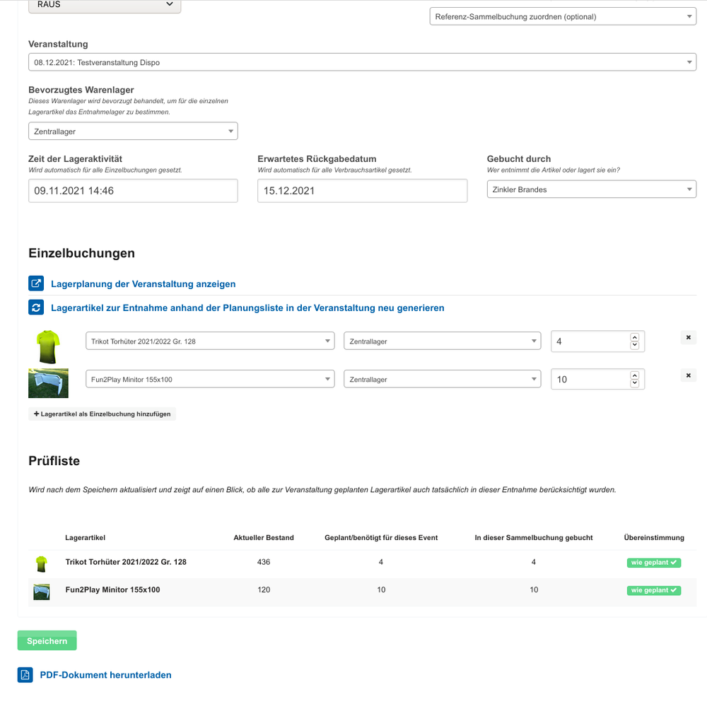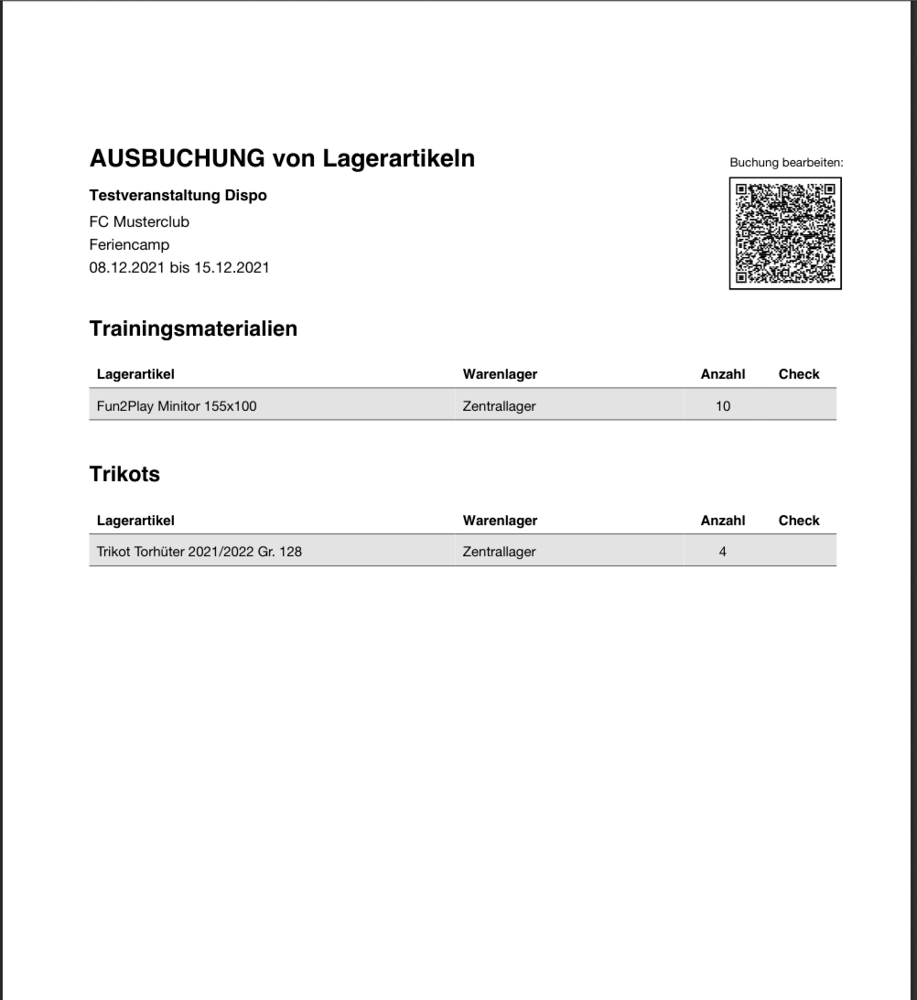 Um Veranstaltungen optimal vorbereiten und Entnahmen und Rücklagen schnell erfassen und dokumentieren zu können, werden Sammelbuchungen erzeugt und aus diesen können PDF-Listen erzeugt werden. Jede PDF-Liste enthält einen QR-Code, mit dem eine Buchung direkt aus dem Lager heraus per Smartphone modifiziert werden kann (z.B. wenn nicht genügend Trikots zur Entnahme am Lager vorhanden sind).
