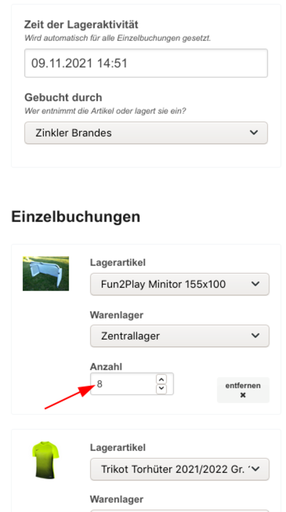 Die Sammelbuchung kann durch Scan des QR-Codes auch direkt bearbeitet werden, z.B. wenn die Anzahl der verfügbaren Artikel zu gering ist und in diesem Beispiel keine 10 Minitore entnommen werden können. Hier sollte der QR-Code gescannt werden und die Buchung der Minitore auf 8 korrigiert werden: