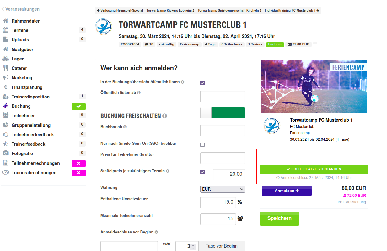 Wöchentlich wiederkehrende Veranstaltungen (Blockveranstaltungen) sind häufig auch noch nach Beginn des ersten Termins buchbar. In den Buchungseinstellungen einer Veranstaltung lassen sich in diesem Fall auch Staffelpreis je zukünftigem Termin einstellen.