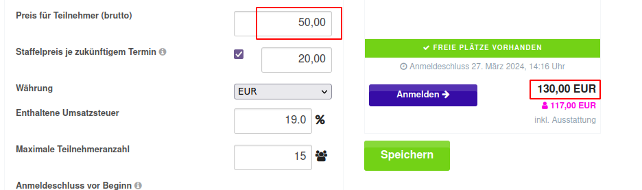 Wird zusätzlich ein Preis pro Teilnehmer (brutto) eingetragen, ist dies der Basispreis zzgl. des variablen Staffelpreises: